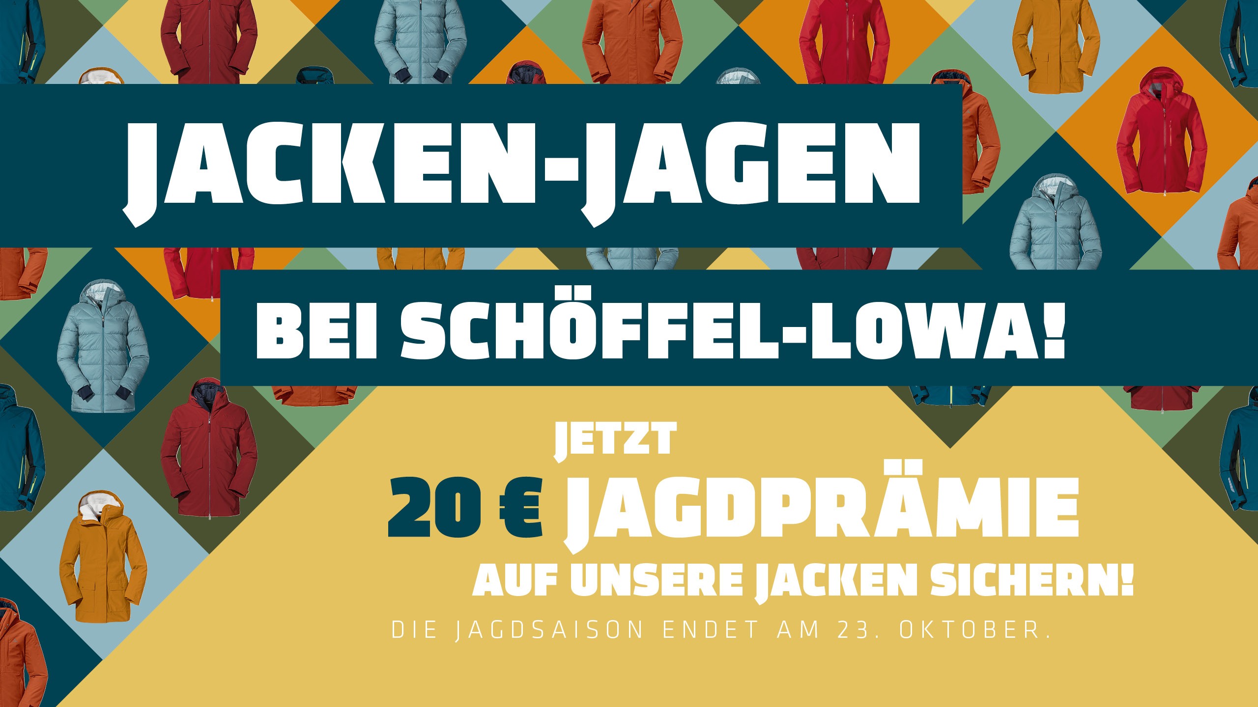 07. Oktober 2021Pirsch dich vom 7. bis zum 23. Oktober in einen Schöffel-LOWA Store, schnappe dir eine Jacke über 199,95€ und freue dich über 20€ Jagdprämie*.