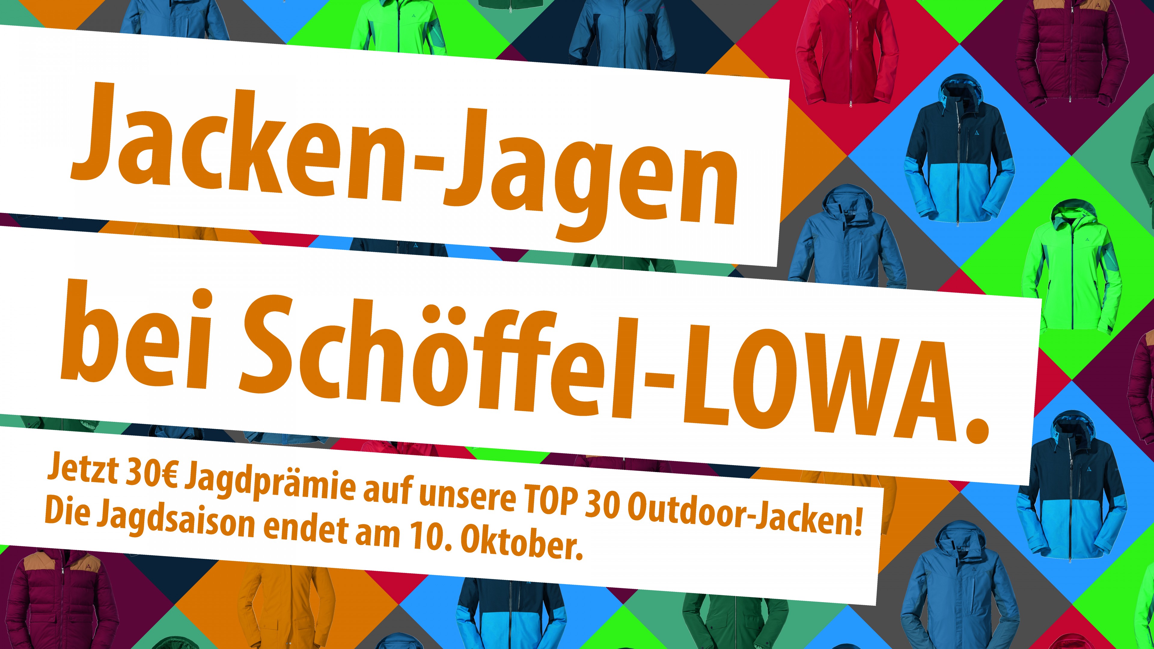 30. September 2020Pirsch dich vom 1. bis zum 10. Oktober in einen Schöffel-LOWA Store, schnappe dir eine unserer TOP 30 Outdoor-Jacken und freue dich über 30€ Jagdprämie*.