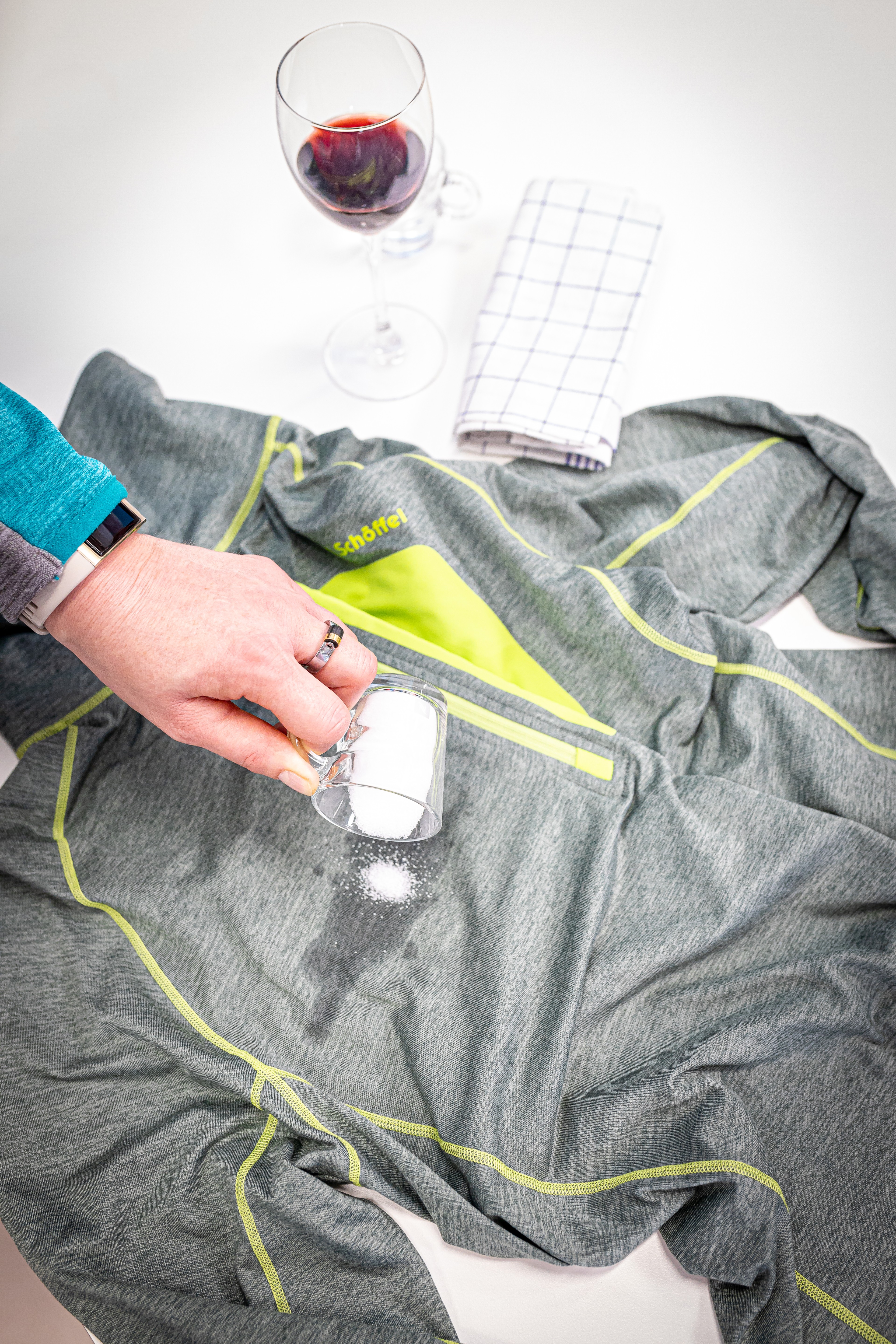 Es kann schon mal passieren, dass Deine Outdoorkleidung Rotweinflecken abbekommt. Wenn das passiert, solltest Du ganz schnell so viel von der Flüssigkeit wie möglich vom Stoff tupfen, bevor der Rotwein einziehen kann. Anschließend gießt Du sprudelndes Mineralwasser über den Fleck und tupfst erneut. Die Kohlensäure sorgt dafür, dass die Farbstoffe sich leichter vom Gewebe lösen. Ist der Rotweinfleck nach dieser Behandlung noch sichtbar, hilft Kochsalz: Einfach auf den Fleck streuen, bis er ganz bedeckt ist, und abwischen.