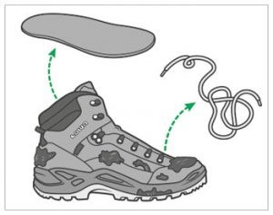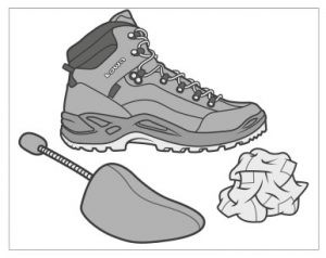 Sind deine Schuhe nass und schmutzig geworden, trockne sie in einem gut belüfteten Raum, aber nicht an Hitzequellen. Das Leder könnte vertrocknen oder brechen. Entferne die Schnürsenkel, damit die Pflegestoffe auch an die verdeckten Stellen deines Schuhes gelangen können. Entnehme auch die Innensohle, insbesondere nach mehrtägigen Touren ist dies wichtig: Gerade in der Einlegesohle sammelt sich viel Feuchtigkeit.