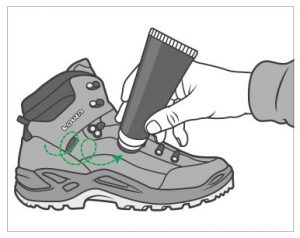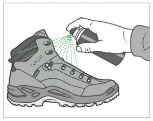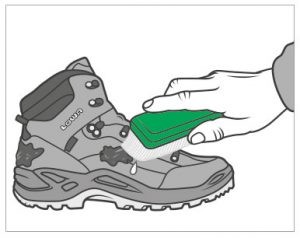 „Textilmaterialien nicht vergessen! Auch die Textilmaterialien an Deinem Schuh sollten regelmäßig imprägniert werden, um den Widerstand des Materials gegen die Aufnahme von Wasser und Schmutz zu verbessern.“